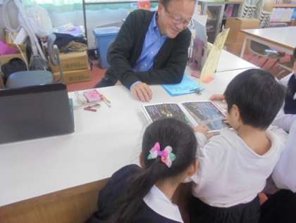 学校図書館補助員の小前先生が、子どもたちに本を読み聞かせてくださっています。