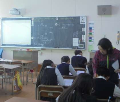 (上)算数の学習。担任の先生がていねいに説明しています。