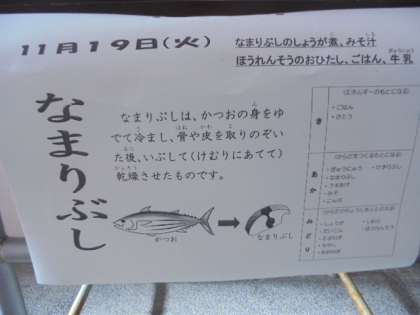 今日の給食は、なまりぶししょうが煮、みそ汁、ほうれんそうのおひたし、ごはん、牛乳です。