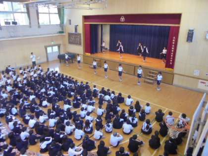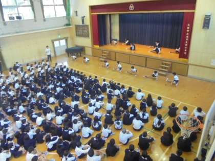 今朝の児童集会では、来週から始まる「なわとびタイム」に備えて、運動委員会の皆さんがなわとびを披露してくれました。