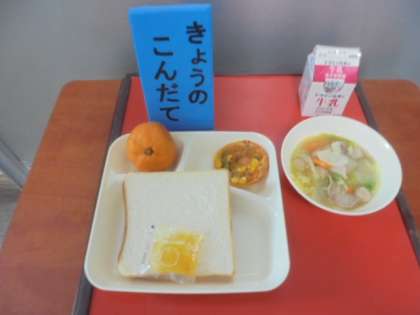 今日の給食は、豚肉とキャベツのスープ煮、変わりピザ、みかん、パン、牛乳です。