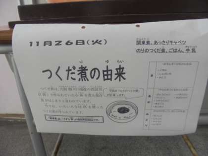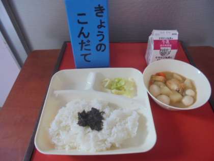 今日の給食は、関東煮、あっさりキャベツ、のりのつくだ煮、ごはん、牛乳です。
