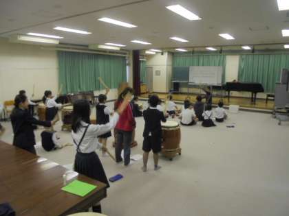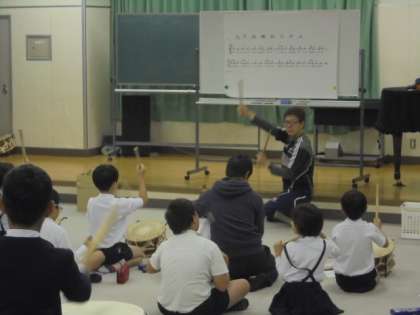 (上・中)太鼓を通した人権学習。講師は、谷山先生です。