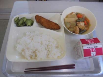 今日の給食は、たらのフライ、豚肉とあつあげの煮もの、あっさりきゅうり、ごはん、牛乳です。