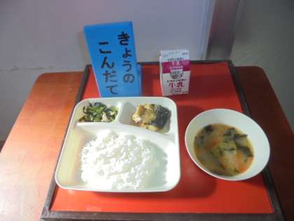 今日の給食は、さばのみぞれかけ、みそ汁、こまつなの煮ひたし、ごはん、牛乳です。