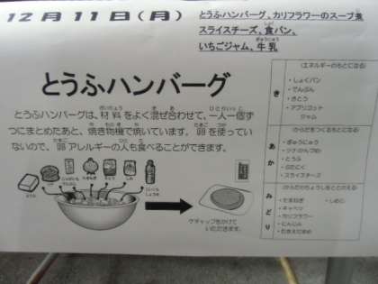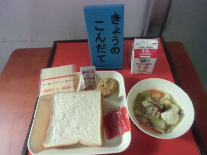今日の給食は、とうふハンバーグ、カリフラワーのスープ煮、スライスチーズ、いちごジャム、パン、牛乳です。