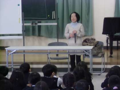 視覚に障がいのある中島千恵さんをお招きして、2年生にお話をしていただきました。ふだんの生活の様子や工夫、目が見えなくなった時の気持ちなどをお話くださり、子どもたちはたくさんのことを学びました。点字の50音表を一人ずつにプレゼントしていただきました。貴重なお話をしてくださり、ありがとうございました。