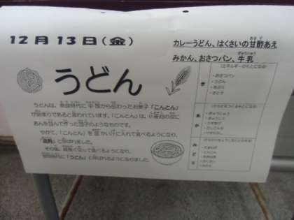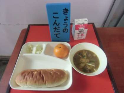 今日の献立は、カレーうどん、はくさいの甘酢あえ、みかん、おさつパン、牛乳.です。