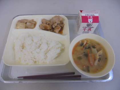 今日の給食は、鶏肉の甘辛焼き、みそ汁、だいこんの煮もの、ごはん、牛乳です。