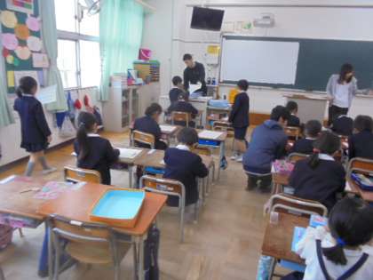 (下)計算プリントの答え合わせ中。
