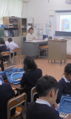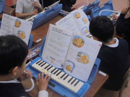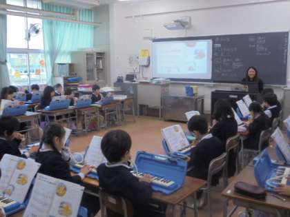 鍵盤ハーモニカで「こぎつね」の合奏をしています。担任の先生の笑顔が素敵です。