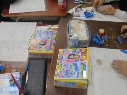(中・下)豆電球とじしゃくの実験セットを組み立てています。