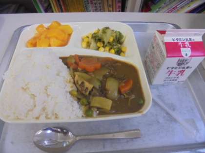 今日の給食は、冬野菜のカレーライス、ブロッコリーとコーンのサラダ、黄桃(カット缶)ごはん、牛乳です。