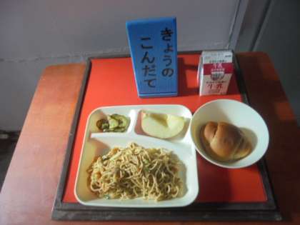 今日の給食は、オイスターソース焼きそば、きゅうりの中華あえ、りんご、パン、牛乳です。