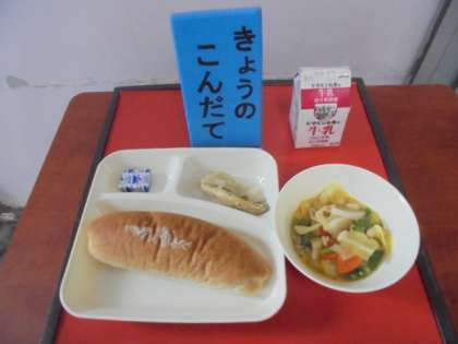 今日の給食は、あじのレモンマリネ、てぼ豆のスープ煮、固形チーズ、パン、牛乳です。