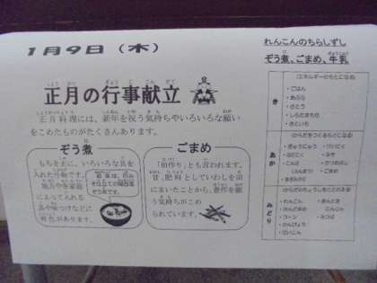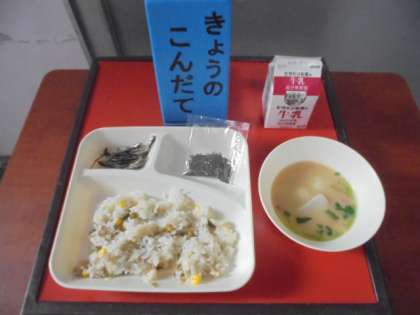 今日の給食は、れんこんのちらしずし、ぞう煮、ごまめ、ごはん、牛乳。