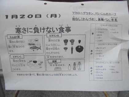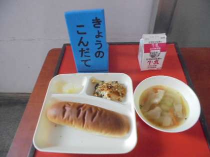 今日の給食は、マカロニグラタン、だいこんのスープ、和なし(缶詰め)、パン、牛乳です。