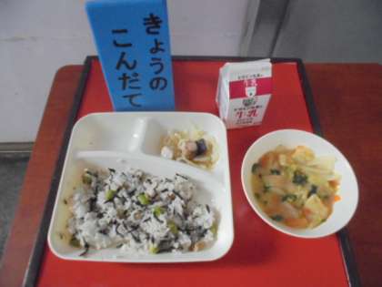 今日の給食は、栄養たっぷり枝豆ひじきごはん、さけのさわやかレモン焼き、冬野菜のみそ汁、牛乳。学校給食献立コンクール最優秀賞作品です。