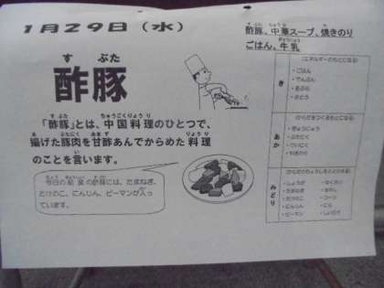 今日の給食は、酢豚、中華スープ、焼きのり、ごはん、牛乳です。