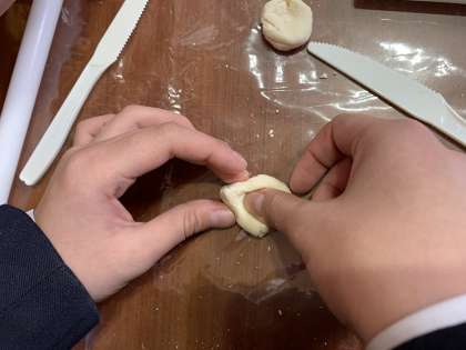 「丸くならへ〜ん」「なに〜。この形!?」と悪戦苦闘しながら皮作りをしました。
