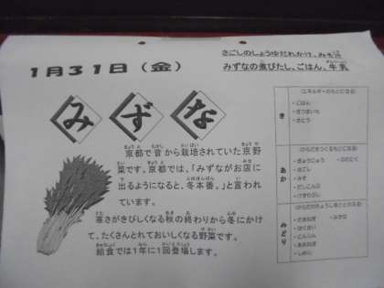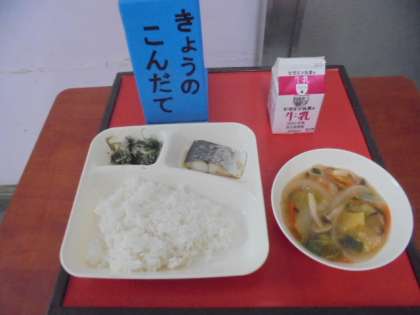 今日の給食は、さごしのしょうゆだれがけ、みそ汁、みずなの煮びたし、ごはん、牛乳です。