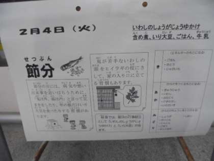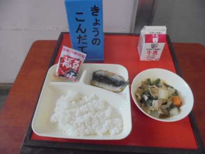 今日の給食は、いわしのしょうがじょうゆかけ、含め煮、いり大豆、ごはん、牛乳です。今日は、節分の献立です。