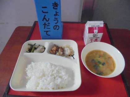 今日の給食は、鶏肉のゆず塩焼き、さつもいものみそ汁、こまつなの煮びたし、ごはん、牛乳です。