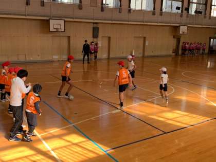 ボールを蹴ってゴールまで運びます。ゴールは協力して守ります。「行け〜、行け〜」「あ〜、惜しい!」「やったぁ、ゴール!」大盛り上がりで試合が終わりました。