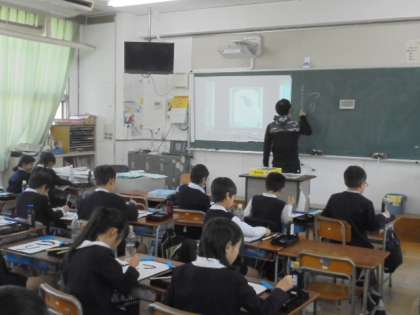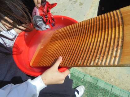 (下)毛筆。電子辞書で「つり」の書き方を習っています。