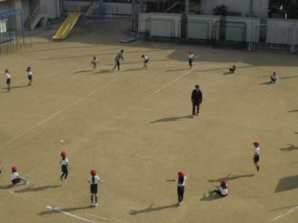 (上)運動場で縄跳びをしています。
