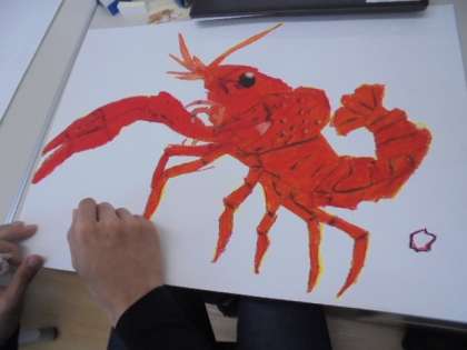 2年の先生が、ザリガニを描きました。子どもたちのお手本です。