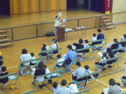 1年担任の先生が、学校生活について資料を使って説明しています。
