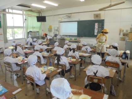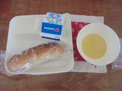 (下)献立は、パン(個包装)、牛乳、ハムと野菜の中華スープです。