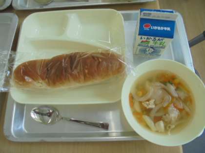献立は、パン(個包装)、牛乳、スープです。