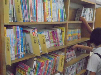 (上)図書室で、本を探しています。