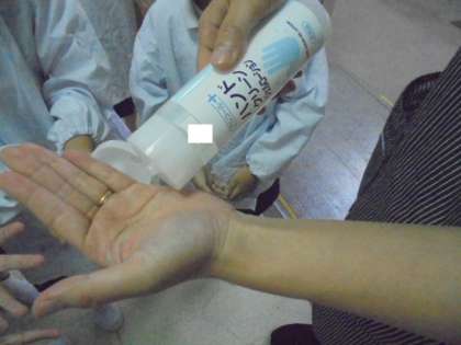 (上)給食を取りに行く前にも、手指の消毒!