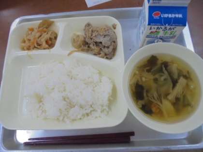 今日の給食は、豚肉の甘辛焼き、すまし汁、切干しだいこんのいため煮、ごはん、牛乳です。