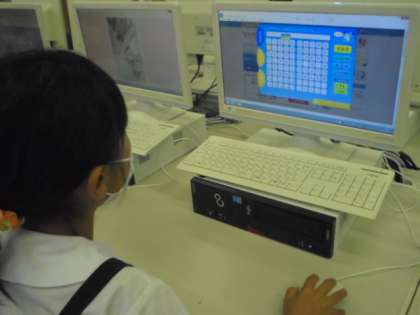 (上)パソコン室で、調べ学習をしています。