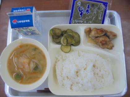 今日の給食は、鶏肉のしょうゆバター焼き、みそ汁、きゅうりのあえもの、ごはん、牛乳です。
