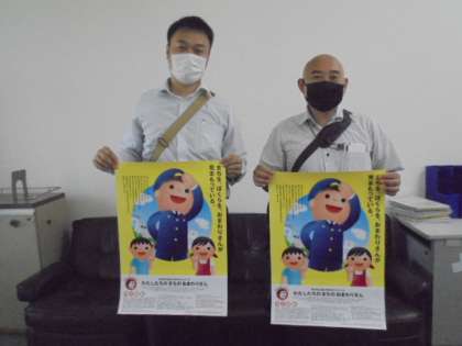お世話になっている浪速警察署少年係の白井係長(右)と左官主任(左)のお二人が、ポスターを届けてくださいました。