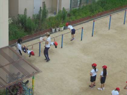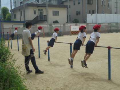 (上・下)鉄棒運動をしています。