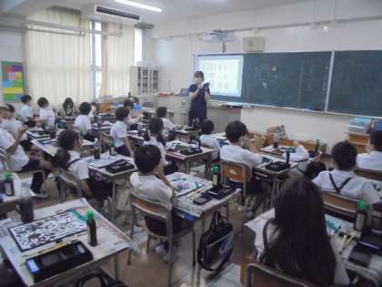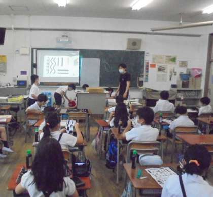 初めての習字です。筆の使い方や道具の置き方などを習いました。