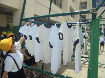 家庭科「洗濯」の実習です。手洗いをして干しています。