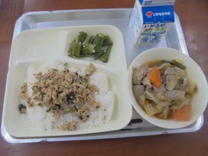 今日の給食は、豚肉とじゃがいもの煮もの、オクラの梅風味、ツナっ葉いため、ごはん、牛乳です。
