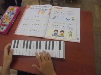 けんばんハーモニカの使い方を練習しています。