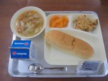 今日の給食は、パエリア、ウインナーとキャベツのスープ、オレンジ、ブルーベリージャム、パン、牛乳です。