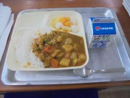 今日の給食は、チキンカレーライス、フルーツ白玉、牛乳です。