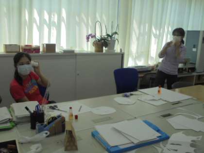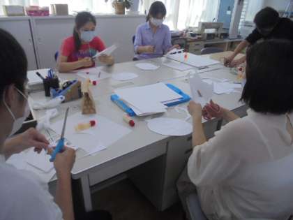 (下)1年の先生方が、生活科で使う糸電話を作って試しています。