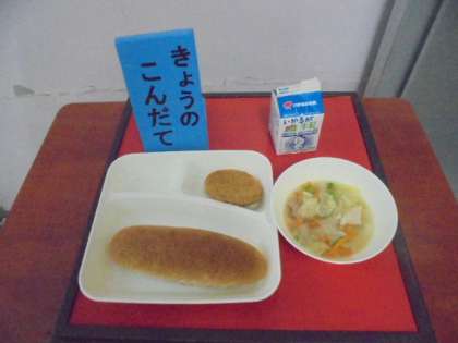 今日の給食は、チキンレバーカツ、スープ、パン、牛乳です。