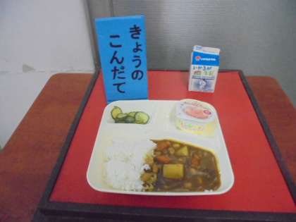 今日の給食は、牛肉と大豆のカレーライス(米粉)、きゅうりのピクルス、りんごゼリー、牛乳です